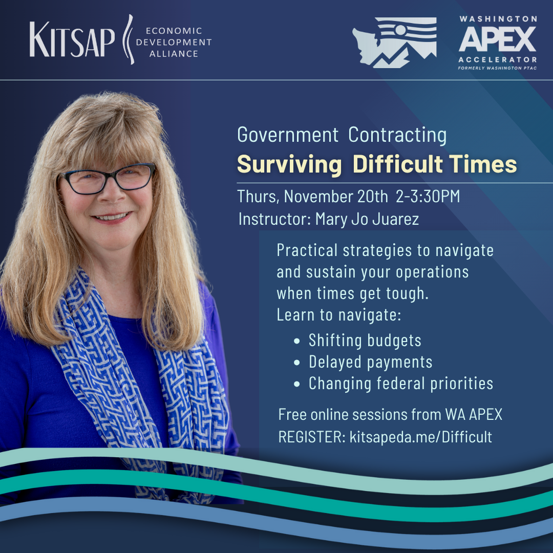Join Mary Jo Juarez for Surviving Difficult Times: Government Contracting Strategies, a free online session hosted by the WA APEX Accelerator in partnership with the Kitsap Economic Development Alliance (KEDA).